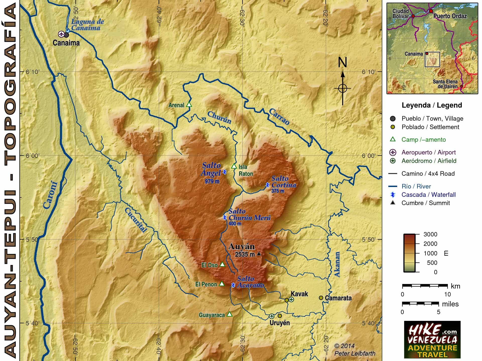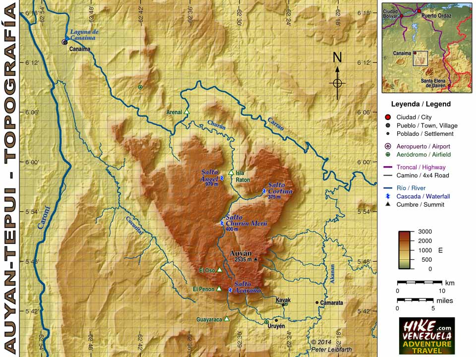 Physical map of Auyan-tepui contains rivers, waterfalls, Pemon settlements and camp sites.