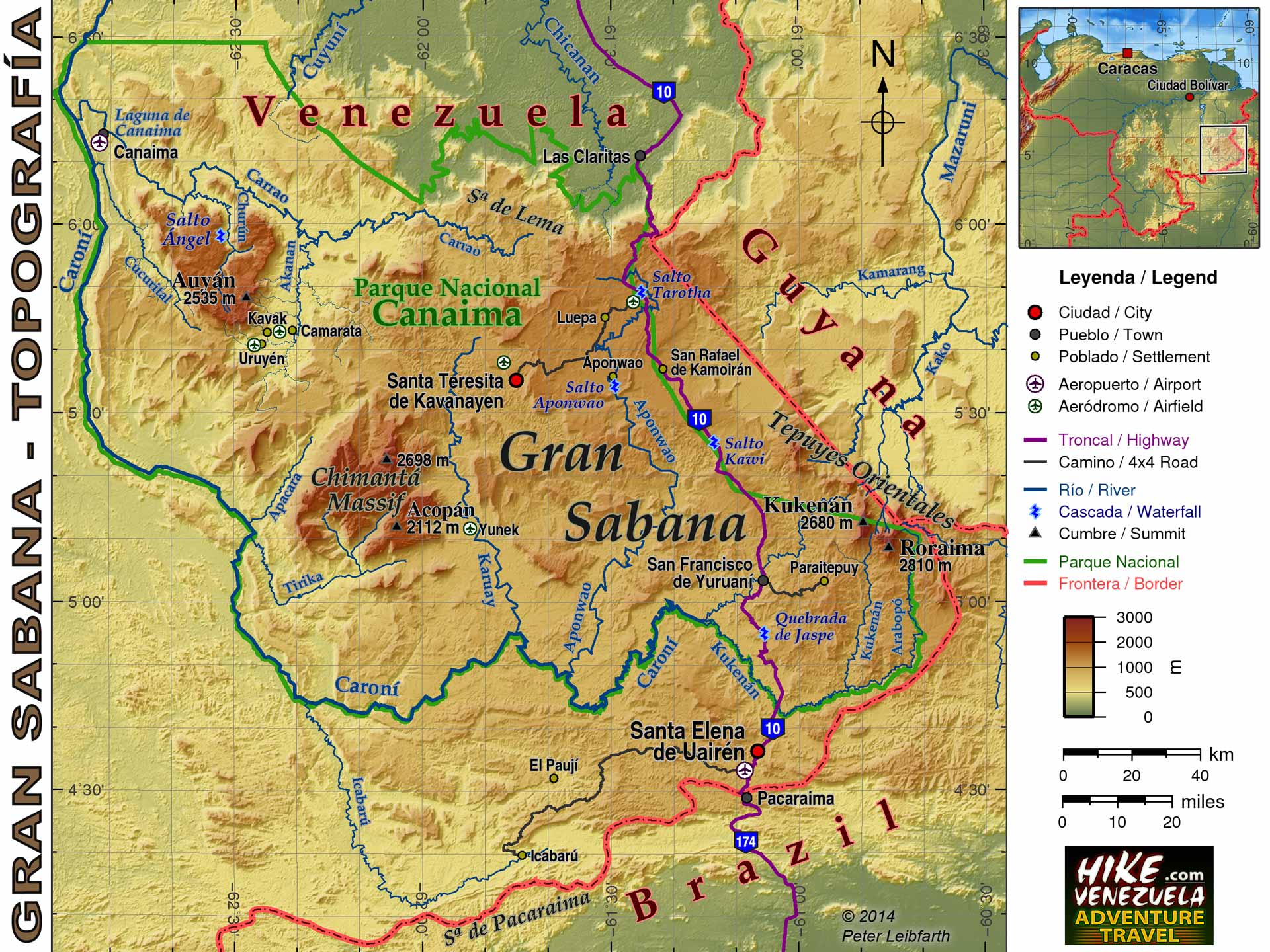 Physical map of Gran Sabana contains rivers, waterfalls, highways, populated places, airports and outline of Canaima National Park.