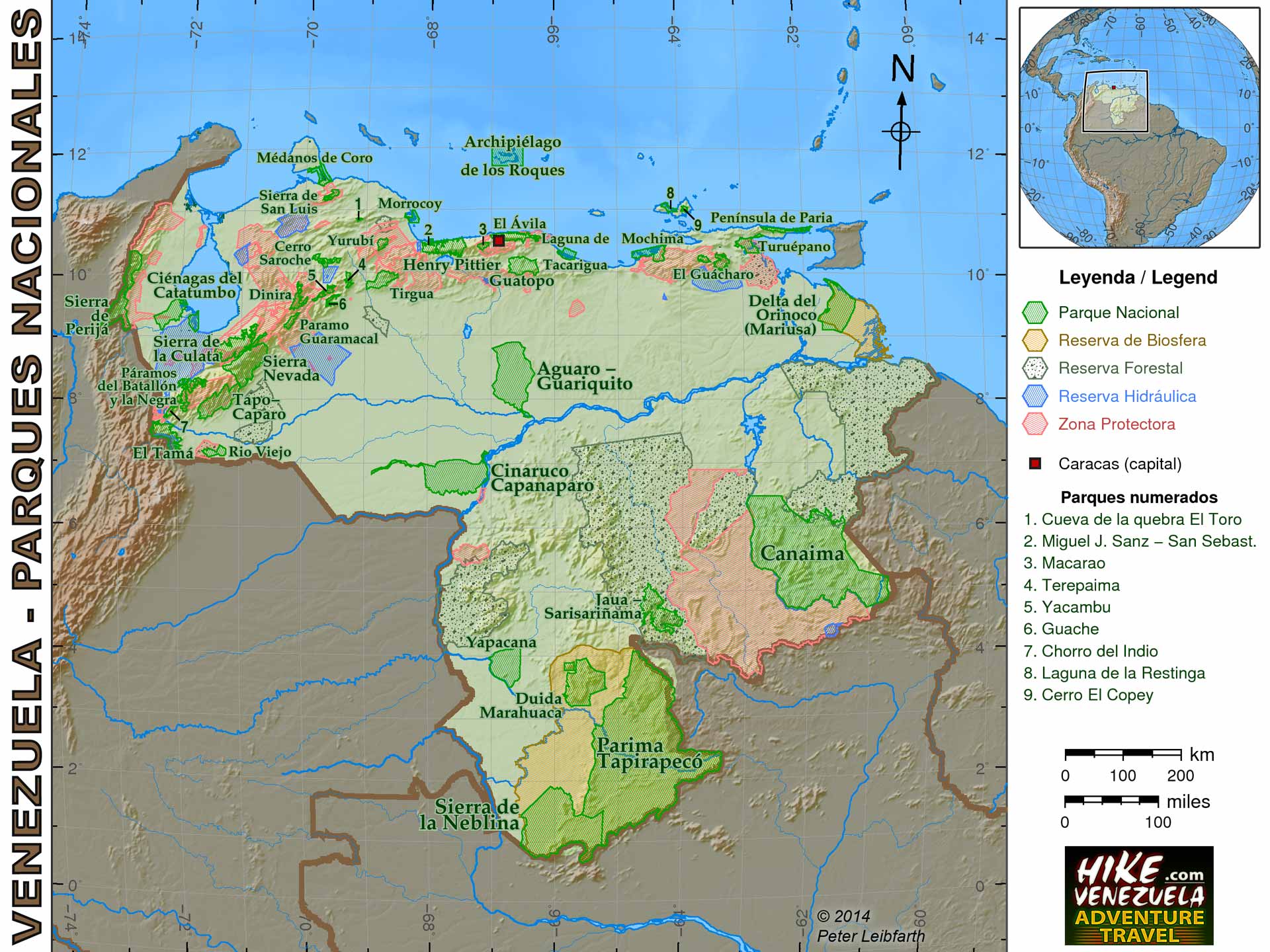 Map contains all National Parks of Venezuela, biosphere, forest and water reservations and protected zones. Official data from IGVSB.