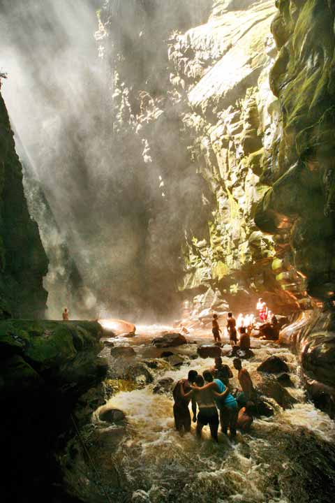 intacte, il se trouve en face de nous: Kavac Canyon avec ses chutes d'eau magnifiques. Ceux qui aiment peuvent prendre un bain dans le canyon en approchant les 40 m de haut cascade. Épuisé mais heureux, le soir nous retournons à nos petits lits ou hamacs suspendus dans les huttes rondes et simples.